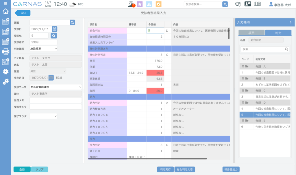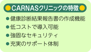 従来の健診システムは、大病院や健診センター向けの大がかりなものが多く、クリニックを対象としたものは少なかった。CARNASクリニックはクリニックの健診業務に特化して開発されたシステムで、日常業務で多忙なクリニックにとって大きなメリットとなる①健康診断結果報告書の作成機能、②低コストで導入可能、③強固なセキュリティ―などの特徴を持つ。結果報告書は様式5号形式、特定健診など複数パターンを用意。日本人間ドック学会の基準に基づき、判定を導くプロセスを自動化しているため、医師は確認とコメント入力に専念できる。