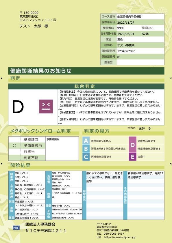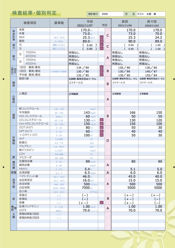 図1健診結果報告書の出力イメージ:カラーでレイアウトも見やすく、日本人間ドック学会の基準に 剃った自動判定機能も搭載。患者が健康管理に活用できる