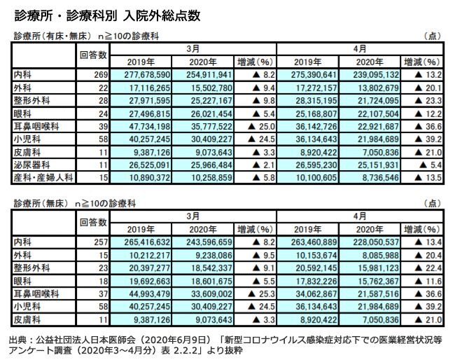 日本医師会の調査「新型コロナウイルス感染症対応での医業経営状況等アンケート」によると、4月は前年同月に比べて、全体で入院外総点数が1割以上減少し、特に小児科(39.2%減)や耳鼻咽喉科(36.6%減)では3割を超える減少が見られると報告されています。