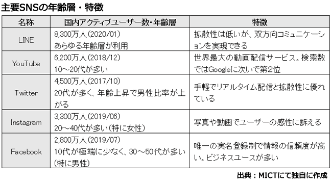 Withコロナの時代では、情報をインターネットから得る患者層が増えており、今後、診療所の主流なマーケティング手法として、定着していくことが予想されます。以下に、国内で普及しているSNSの年齢層と特徴をまとめました。情報を届けたい患者の年齢層や性別などを考えながら、有効に活用していただければと思います。