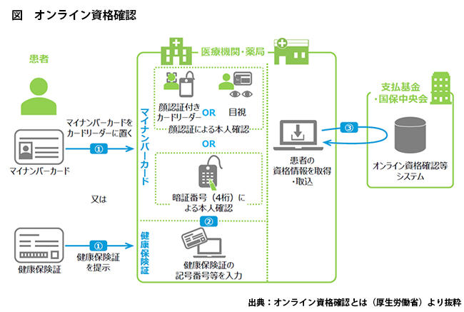 一方、「保険証の登録・確認業務」については、「オンライン資格確認」という事業を政府が進めようとしています。マイナンバーを保険証と紐づけ、マイナンバーカードのICチップまたは健康保険証の記号番号を用いた、オンラインでの資格情報(保険の有効期限など)の確認が可能となります。
