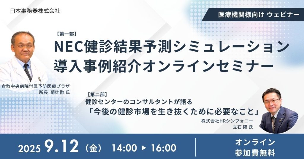 【終了】「NEC健診結果予測シミュレーション導入事例紹介」を開催します 投稿日 : 2025-09-01 このたび弊社では、「予防医学」と「NEC健診結果予測シミュレーション」を組み合わせた新しい健康管理の取り組みについてご紹介するセミナーを開催いたします。 生活習慣病などの疾患リスクを早期に把握し、予防に結びつけるための最新アプローチを、具体的な事例とともにお伝えいたします。 投稿ナビゲーション ← 弊社CARNASが「デジタル化の窓口」で紹介されました 無料メールマガジンご案内 クリニックや健診施設の皆さまに役立つ情報を随時お届けします! 購読する お知らせ コラム 人事労務Q&A 医療福祉経営の眼目 医療福祉経営の要諦 病院経営Q&A