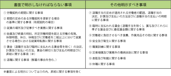 この条文でいう「厚生労働省令」とは、労働基準法施行規則第5条のことを指しており、その規則による明示すべき事項は以下の通りです。