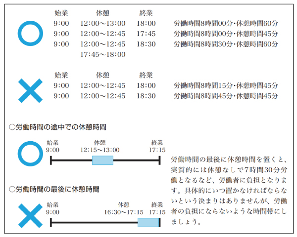 労働時間の最後に休憩時間を置くと、実質的には休憩なしで7時間30分労働となるなど、労働者に負担となります。具体的にいつ休憩を付与しなければならないとういう決まりはありませんが、労働者の負担にならないような時間帯にしましょう。