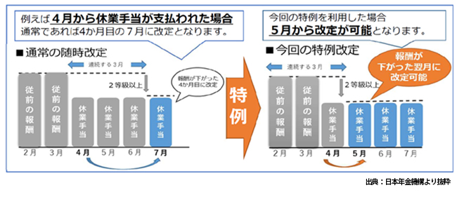 今般の新型コロナウイルス感染症の影響により休業した方で、休業により報酬が著しく下がった方について、一定の条件に該当する場合は、健康保険・厚生年金保険料の標準報酬月額を、通常の随時改定(4カ月目に改定)によらず、特例により翌月から改定可能です。