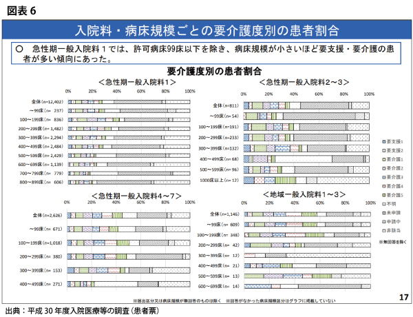 厚生労働省や多くの専門家が指摘していたように「転換した方が経営が安定する」との見方は取らず、多くの病院は2018年度診療報酬改定の内容を極めて冷静に見ながら対処してきたように感じられる。同じ入院料を算定していたとしても規模が小さい病院になる程、自立度の低い要支援・要介護の慢性期高齢患者の割合の高くなることが明らかになっており(図表5・6)、これは専門病院も同様である。