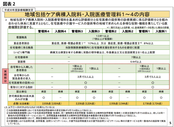 それは、2018年度改定で従来は2段階だった地域包括ケア病棟の診療報酬が4段階に再編され、入院料・入院医療管理料の1と3に関して「地域包括ケアに関する実績」評価が導入されるようになったこと。加えて、自宅や介護医療院等の自宅扱いとなる施設からの受け入れを評価する「在宅患者支援(療養)病床初期加算」(300点)が新設され、急性期病棟からの患者受入れを評価する「急性期患者支援(療養)病床初期加算」(150点)と比較して2倍の高評価が行われているのを見ても、それは明らかだ。厚生労働省の地域包括ケア病棟に対してのメッセージが直截的に伝わってくる改定ポイントとなった(図表1~2)。