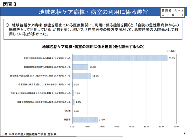2018年11月29日に開催された中医協総会では、「地域包括ケア病棟が3つの役割をバランス良く担うことは重要」としながらも、自院の一般病棟からの地域包括ケア病棟への転棟が多いことに対して、一部の委員から抑制の必要性が指摘されてもいた。