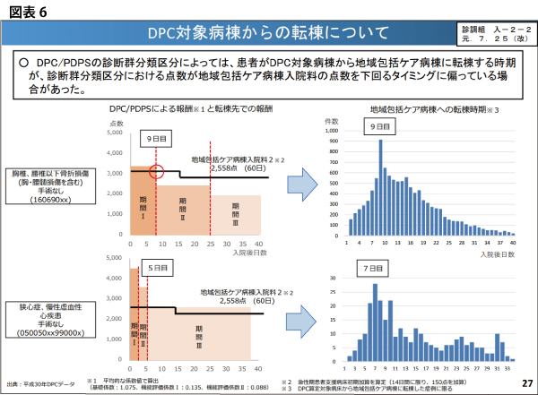 そして、中医協でも重要な論点とされてきたのは、「一般病棟から地域包括ケア病棟に転棟・転室時における入院料の算定方法」だ。つまり、同一病院でDPCを導入する一般病棟内で地域包括ケア病棟に転室した場合「地域包括ケア病棟入院料等」を算定していたが、同一医療機関内で「DPC病棟から地域包括ケア病室に転室」した場合、転室後も「一般病棟(DPC/PDPS)による点数」を算定することが常態化してきた。なぜ、当該病院が「転室後もDPC/PPSによる点数」を算定してきたのかと言うと、「DPCの入院期間がIからIIへと切り替わり、日当点が減額されるタイミング」での地域包括ケア病棟への転棟が圧倒的に多いことが、中医協で明らかになった(図表4~6)。