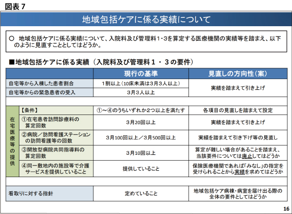 実績要件にある「自宅等から入棟した患者割合」の「現行10%以上・10床未満は3カ月で3人以上」および「自宅等からの緊急患者受け入れ」の「現行3カ月で3人以上」ルールは“実績”と言うにはハードルが低過ぎることから、前者については「20%以上」、後者については緊急患者受け入れも含めて「3カ月で5人以上」に引き上げられるのではないかと予想される。