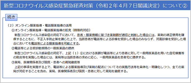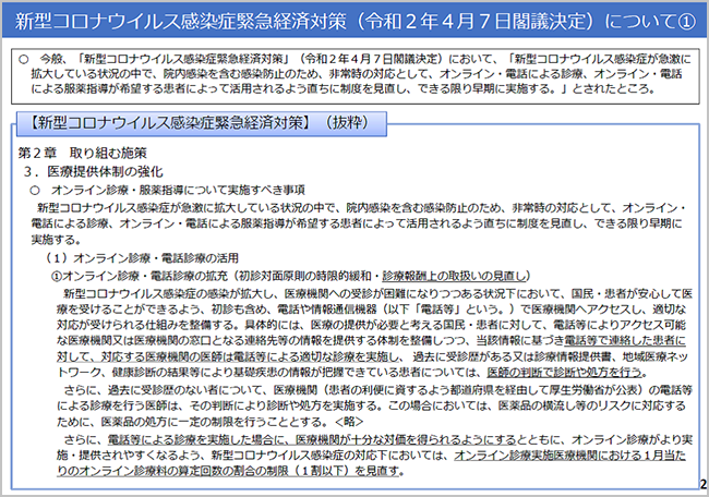 この他、2020年4月以降、オンライン診療を実施する医師は現行「厚生労働省の指針に基づきオンライン診療の研修を受講しなければならない」とされていたが、医療保険における時限的・特例的な取り扱いの継続している間は、当該研修を受講していない医師がオンライン診療や、電話・情報通信機器を用いた診療を継続しても構わない。
