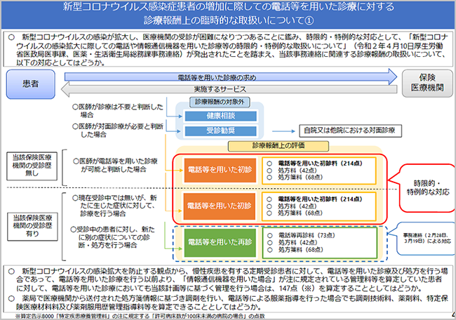 また、診療報酬での電話再診料の要件も緩和するが、「現在、受診中ではないものの新たに生じた症状に対して診療を行った」場合の「初診料」の設定も同時に行った。要するに、テレビ電話のみならず電話だけで、受診歴のない初診患者に診療を実施することも可能になった。
