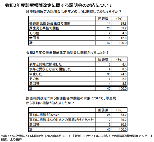 医療現場における診療報酬算定上の課題は、全都道府県医師会で「令和2年度診療報酬改定説明会を中止」した地域が74.5%に及び、「例年通り開催した」(6.4%)、「例年とは異なる方法で開催した」(8.5%)を大きく上回り、診療報酬改定に係る情報収集に大きく出遅れたこと。「例年とは異なる方法」で開催したのは4県医師会だが、その方法とは、「3月5日に都道府県医師会・社会保険担当理事連絡協議会のテレビ中継を地域医師会担当理事に聴講してもらった」こと。また、「厚生労働省における説明会の動画DVD、スライド資料、冊子等を郡医師会経由で医師会員宛に配布する」形で行われた。