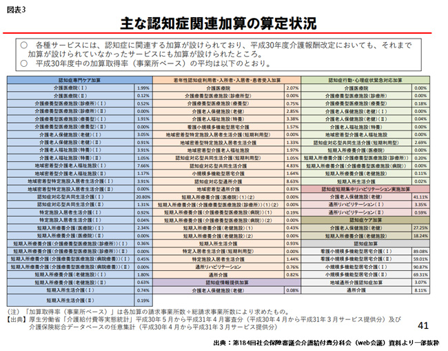 介護サービス各事業所の「認知症専門ケア加算」、「若年性認知症利用者・入所者・入居者・患者受け入れ加算」、「認知症行動・心理症状緊急対応加算」等、認知症にかかわる加算の算定状況は現状極めて少ないものの(図表3)次回改定では報酬アップや要件緩和等で、算定拡大を促す可能性が高い。(3)に関しては「介護の質の評価と科学的介護の推進」の観点から、「介護の改善を評価する指標が介護現場で導入される」のかが重要なトピックである。