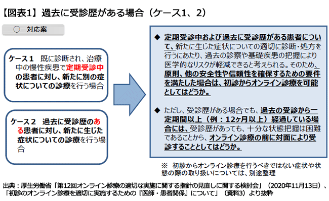 まず、前者の過去に受診歴のある患者の初診。厚労省は、この中にもさらに、▽慢性疾患で定期受診中の患者で新たに生じた別の症状に対する診療(ケース1)▽現在通院中ではないが、過去に受診歴がある患者で新たに生じた症状に対する診療(ケース2)―の2つのパターンがあると説明。いずれも、過去の受診時に患者の基本的な情報を把握できていることや、医師・患者間の信頼関係がある程度構築されていることなどを考慮し、初診からのオンライン診療を認める考えを示している(図表1)。