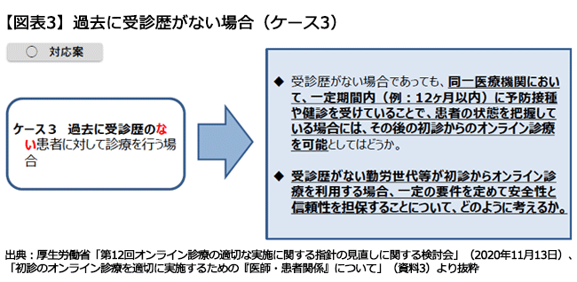 検討会の議論で、ケース1、2および4をオンライン初診の対象とすることに大きな反対はなかったが、慎重論が目立ったのがケース3の扱い。全くの新規で、かかりつけ医からの情報提供もないこのケースについて、厚労省はオンライン診療を行うのと同一医療機関で12カ月以内に予防接種や健診を受け、患者の状態を把握できている場合という条件付きで、初診からのオンライン診療を解禁する案を提示した(図表3)。